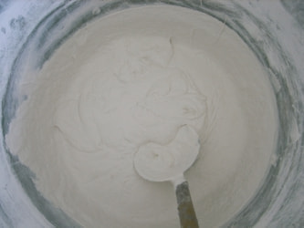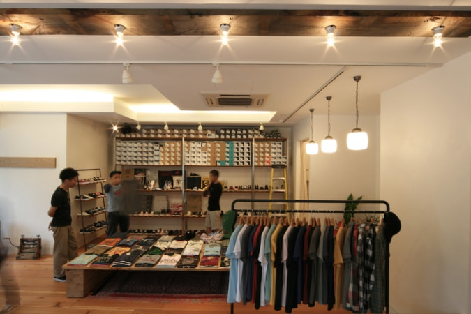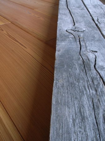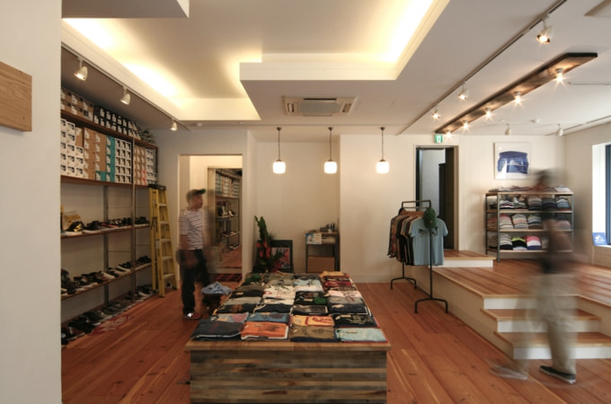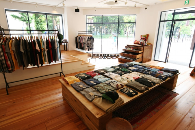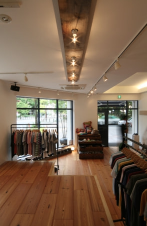 什器の一部は栗の木を使ったモノ 木曽福島へ材木を探しに、オーナーと建具屋とで出向き、材木の山から見つけたのが、色あせた栗の木でした。野積みで紫外線にヤレタ材を積層して什器としました。