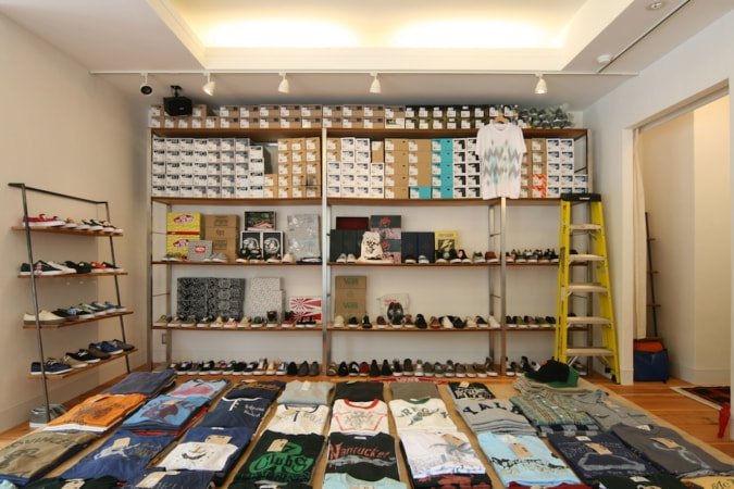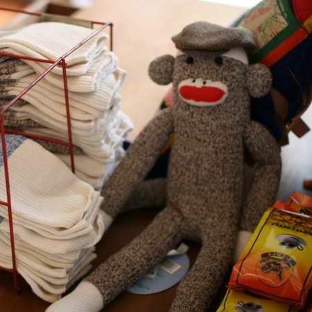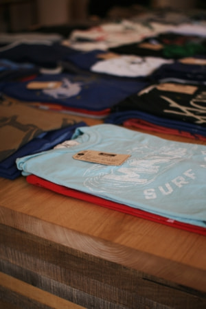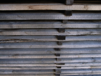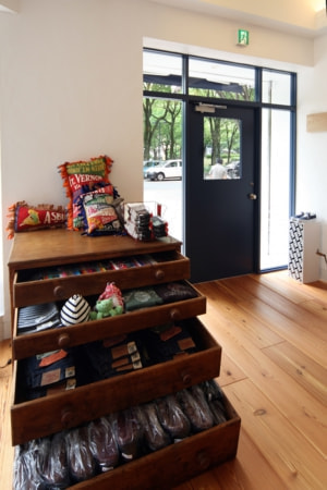 什器の一部は栗の木を使ったモノ 木曽福島へ材木を探しに、オーナーと建具屋とで出向き、材木の山から見つけたのが、色あせた栗の木でした。野積みで紫外線にヤレタ材を積層して什器としました。